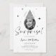 Shhh es una invitación sorpresa de cumpleaños con un gorra de purpurina de plata cubierto por foto.