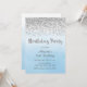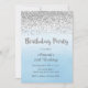 Invitación de cumpleaños con diseño falso purpurina plateado y fondo de color azul oscuro.