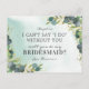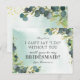 ¿Estás pensando en pedirle a alguien que sea tu dama de honor para tu futura boda? Entonces, ¿por qué no elegir estas tarjetas postales de invitación de dama de honor con temática de vegetación rústica? Esta invitación personalizada hará que tu amiga, hermana, prima, sobrina, hija o quienquiera que elijas se sienta aún más especial. Esta tarjeta cuenta con elegantes hojas de eucalipto botánico de acuarela, salpicaduras de dorado y el texto "No puedo decir 'sí, acepto' sin ti".