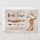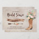 Esta invitación de despedida de soltera con tema occidental presenta una bota de acuarela, dos arreglos florales, una flecha y un estandarte sobre un fondo de acuarela similar a la madera. Ideal para alguien que tiene una boda de estilo campestre o occidental. Esta invitación de despedida de soltera con tema de vaquera u occidental está lista para ser personalizada.