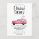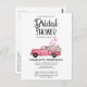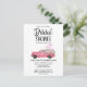 Un camión/coche vintage rosa polvo está lleno de rosas rosadas y globos festivos. La postal es parte de una colección.