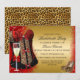 Invitación de despedida de soltera roja y dorada. Hermoso corsé con estampado de leopardo y tacones con plumas rojas brillantes. Tenga en cuenta: ¡Todas las imágenes planas!