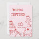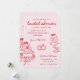 Invitación de despedida de soltera roja y rosa con champán, pastel y anillos