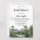 Celebra a la futura novia con esta impresionante invitación inspirada en el aire libre. Con un paisaje de acuarela pintado hermosamente de altos pinos, aves volando alto y una majestuosa escena montañosa azul y verde, establece el tono perfecto para una despedida de soltera llena de naturaleza.