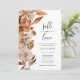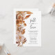 Invitación de Despedida de Soltera Otoñal Elegante. Esta elegante y rústica invitación de despedida de soltera 'enamorarse en otoño' cuenta con hojas de color naranja quemado y terracota pintadas a mano con acuarela, dahlias crema y beige, y hermosas rosas de color óxido perfectas para una boda de otoño. La parte trasera de la invitación tiene un fondo blanco simple con un ramo coordinado.