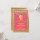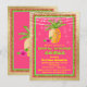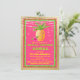 Invitación de Despedida de Soltera Tropical con hermosa piña y flor de hibisco en un hermoso fondo de lámina dorada, verde lima y rosa caliente con luces de cuerda. Esta invitación de Despedida de Soltera de soiree luau se personaliza fácilmente para su evento simplemente agregando sus detalles en el estilo de fuente y redacción de su elección. Este es un diseño impreso sin lámina real, purpurina, etc.