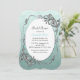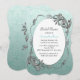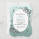 Elegante invitación de despedida de soltera, realizada en un patrón de damasco estampado en relieve verde menta, con un marco floral de tono plateado decorativo alrededor del área de texto ovalada blanca. Personalice todo el texto según las necesidades de su evento. Elija el papel de tarjeta que desee y la forma de invitación que más le guste.