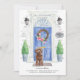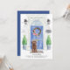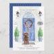 Anuncie su nueva dirección con nuestra elegante invitación con un Cockapoo marrón, puerta delantera azul, estera de bienvenida, letrero de pizarra, topiarios y una corona floral sobre un fondo de ladrillo gris.