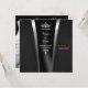 Celebra tu día especial con la elegancia atemporal con esta plantilla de invitación a la boda del diamante negro. La parte delantera cuenta con un sofisticado gráfico de esmoquin, con un detallado diseño de chaqueta de cuatro bolsillo, que incluye un bolsillo de pecho y bolsillos delanteros inferiores, lo que le confiere una lujosa sensación de corbata negra. Se incluyen un título de destino y un marcador de posición de fecha para una personalización sencilla. En la parte de atrás se muestra un vestido de bolas de corsé con cuentas de cristal colocado sobre un fondo de enmalle negro, con una invitación elegantemente enmarcada por los acentos de fleur-de-lis encima y debajo. Perfecto para las parejas que buscan un personalizable, un diseño de gama alta que exuda el glamour clásico y la sofisticación formal.