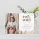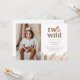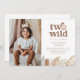 Esta invitación de cumpleaños presenta una dulce cara de león en acuarela con la frase "dos salvajes", acentuada por hojas de jungla de tonos neutros a lo largo de la parte inferior. También puedes agregar tu propia foto del niño o niña que cumple años. ¡Perfecto para una celebración de segundo cumpleaños con tema de safari!