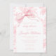 Celebra la llegada de tu pequeño con nuestra linda invitación de ducha de bebé niña con tema Coquette shabby chic. Con lazo de cinta rosa bebé en arco bohemio y patrón floral vintage en el reverso, esta invitación establece el tono perfecto para una dulce celebración preppy.