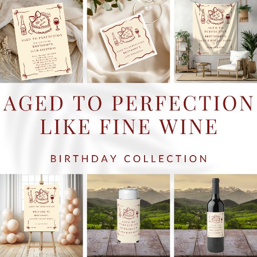 Invitación a la fiesta de cumpleaños "Aged to Perfection" - Cumpleaños importante para su celebración con estilo con esta moda y la divertida invitación de cumpleaños de Aged to Perfection, perfecta para cumpleaños de un hito incluyendo celebraciones del 30, 40, 50 o 60. Diseñado con una sofisticada paleta de color burdeos y crema, esta invitación incluye extravagantes garabatos a mano, pulgones divertidos y encantadores ilustraciones de una tarta de cumpleaños vintage, una botella de vino y una copa de vino. Un delicado marco de arco de coqueta le da un toque de elegancia, mientras que el motivo "Elevar una luna" da un tono festivo y festivo. Esta plantilla editable le permite personalizar cada detalle para una invitación fiesta verdaderamente única. Elija descargar instantáneamente para compartir digitalmente o solicitar impresión profesional a través de Zazzle para un diseño pulido y listo para enviar. Perfecto para las mujeres que aman el vino, el humor y las celebraciones de cumpleaños, esta invitación combina elementos elegantes, divertidos y creativos en un diseño inolvidable.