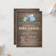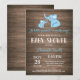 Tarjeta azul de la invitación al elefante Baby Shower con fondo de madera rústica. Retro Vintage. Muchacho Invitado de Baby Shower. Para una mayor personalización, haga clic en el botón "Personalizar" y utilice nuestra herramienta de diseño para modificar esta plantilla.
