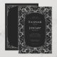 Estas invitaciones nupciales de 5" x 7" presentan un estilo gótico con un falso encaje en blanco y negro con la introducción "Junto con sus familias, por favor únanse", junto con marcadores de posición para los nombres de la pareja boda, fecha, hora, lugar, dirección del lugar con el mensaje de abajo, "recepción a seguir".