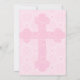 Invitación del bautismo del chica elegante, o primera invitación de la comunión, hecha en un modelo rosado y blanco bonito del damasco del círculo, con una cruz coloreada más oscura encajada en el fondo. Personalice el texto gris oscuro para el bautismo de su niño. Manera preciosa de invitar a amigos y a la familia, que atestigüen el día especial de su niño en la iglesia.