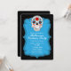 Invitación de fiesta azul y cráneo de azúcar colorido. Personalízala como quieras. Artículos coincidentes disponibles.