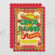 Esta invitación con tema Cinco de Mayo es la forma perfecta de preparar el escenario para tu cumpleaños de fiesta mexicana. En la parte superior hay un gran sombrero con las palabras Cinco de Danno Fiesta debajo. El borde escalopado recuerda a las banderas de papel picado que cuelgan de las calles de México. Personaliza esta invitación con todos los detalles divertidos de tu fiesta. Los colores incluyen rojo, amarillo, naranja, verde y negro.