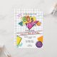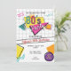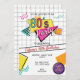 La invitación de fiesta de los 80 cuenta con una tipografía brillante y colorida de ''Fiesta de los 80''. Estos diseños incluyen elementos de color azul brillante, naranja y rosa, amarillo, púrpura, una cuadrícula geométrica, formas y gráficos inspirados en los 80. Incluye una plantilla para personalización personal.