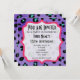 Una invitación perfecta para un cumpleaños o cualquier otra ocasión. Fondo con estampado de leopardo púrpura en ambos lados. La parte delantera presenta texto negro personalizable dentro de un marco de corchetes rosado.