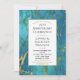 Una elegante invitación de aniversario con rico mármol verde azulado con incrustaciones de oro y un marco dorado.