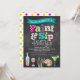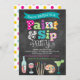 Nuestra brillante y colorida invitación de estilo pizarra para fiesta de pintura y bebida es la invitación perfecta para cualquier evento de pintura y vino. Nuestro diseño presenta un fondo de pizarra, una mezcla de divertidas letras de patrón como puntos, rayas y chevron, y ilustraciones y gráficos de arte como una paleta de artista, botella de vino, copa de vino y margarita.