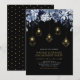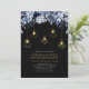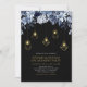 Invite a sus invitados a su día de celebración especial con esta hermosa invitación de fiesta de compromiso. Este diseño sofisticado cuenta con hermosas flores de tono azul y luces de cuerda doradas con accesorios de luz geométricos. Puede personalizar el texto y el color de fondo. Invitación perfecta para una fiesta de compromiso invernal moderna.