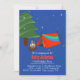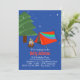 Invitación colorida para la fiesta de cumpleaños de un niño acampando hecha en azul oscuro con una colorida carpa, un árbol de pino, estrellas y un pequeño y feliz fuego de campamento. Personalice todo el texto para el fiesta de campamento de su hijo.