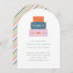 Una pila de maletas coloridas se sienta en la parte superior de esta caprichosa invitación de fiesta de despedida. Debajo de la ilustración del equipaje hay espacio para el nombre del invitado de honor y los detalles de la fiesta. La parte posterior de la tarjeta presenta un patrón de franjas diagonales coordinadas. ¡Esta invitación es perfecta para cualquiera que esté a punto de embarcarse en una nueva aventura!