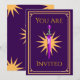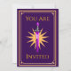 Invitación de cumpleaños de espada morada mágica perfecta para un héroe de 5 años. Ideal para fiestas temáticas de guerreros de fantasía y celebraciones épicas para niños. Texto editable para nombre, fecha y detalles de la fiesta.