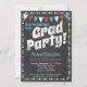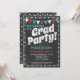 Una divertida invitación de fiesta de graduación de pizarra acuática y roja con texto grueso "¡Fiesta de graduación!" en la parte superior con fondo de pizarra, banderas y un borde de lunares lindo.