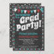 Una invitación de fiesta de graduación divertida y acuarela en pizarra de tiza roja con texto en negrita "¡Fiesta de graduación!" en la parte superior con fondo de pizarra, banderas y un borde de lunares adorable.