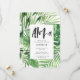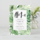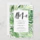 Invitaciones modernas a fiestas folclóricas con hojas de palmera tropicales. Texto del guión de efecto pintado a mano. Parte de una colección de verano sobre tendencias. Se puede cambiar el color de fondo.