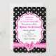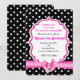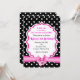 Invitación de fiesta de lunares blancos y negros con lazo rosa. Personalízala para cualquier evento.