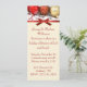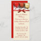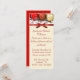 Invitación festiva de fiesta, hecha con una larga carta delgada, con una fotografía de ornamentos de Navidades rojos y dorados en la parte superior de las invitaciones. Un satén rojo que mira la cinta y se dobla como un borde entre la parte superior y el área de texto de color crema. Personalizar el texto para adaptarlo a sus necesidades.