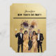 Invitación elegante de Nochevieja semi formal dorada y negra hecha con un buen estilo con fuegos artificiales y un grupo de amigos bailando.