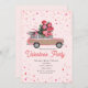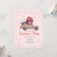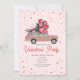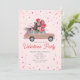 Una invitación de fiesta de San Valentín con una ilustración de un camión SUV rosa con paneles de madera adornado con un ramo de rosas de gran tamaño. El fondo es rosa claro con confeti.