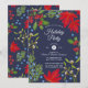 Invitación elegante de fiesta de vacaciones. Ilustración con arce brillante, acebo, muérdago y enebro en fondo azul oscuro. Agrega tu texto.