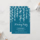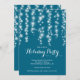 Modernas y brillantes cadenas blancas brillantes sobre una elegante invitación de navidades de fondo azul. Voltea nuestro elegante copo de nieve invernal invitamos a ver una parte de atrás para un toque especial.