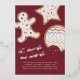 Invitar a niños de todas las edades a decorar galletas de Navidad y celebrar la temporada navideña con esta festiva invitación a la fiesta. Las galletas en forma de hombre de pan de jengibre, estrella y círculo están decoradas alegremente con espuma y una variedad de rociadores de colores. El ilustracion se coloca sobre un fondo rojo con una textura moteada, y se acompaña con la frase "decoremos y celebremos..." en letras manuscritas y escritas a mano y presionadas por el Relieve metalizado.
