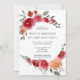 Invitación de cumpleaños floral de acuarela rústica boho elegante con rosas y vegetación con colores vívidos y vibrantes en durazno, rosa y burgundy. Fondo marsala burgundy. Puede ser personalizada.