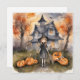 Pequeña bruja linda esperando afuera de su humilde casa, todas listas para dar la bienvenida a su invitado de Halloween