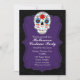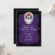 Invitación de fiesta morada y cráneo de azúcar colorido. Personalízala como quieras. Artículos coincidentes disponibles.