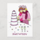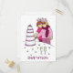 Una imagen simple y divertida de dos mujeres que llevan ropa rosa cortando una gran tarta de celebración, unión civil o boda. La imagen está acompañada de la palabra 'Invitación' y está sobre un fondo blanco.