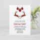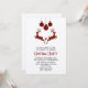 Una invitación de fiesta de Navidad con una ilustración de 2 ciervos de Navidad saltando. Los ciervos están hechos de cuadros de leñador rojos y negros, con un pequeño corazón entre ellos. Decoraciones de Navidad de cuadros rojos y negros cuelgan de la parte superior.