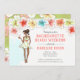 La invitación de fin de semana en la playa para despedida de soltera presenta un tema tropical con flores de hibisco y la futura novia disfrutando de un cóctel. Disponible con chica de pelo rubio, marrón, rojo y con piel oscura o clara. La parte trasera de la invitación muestra el cóctel y los detalles.