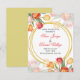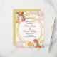"Invitación de boda vibrante adornada con tulipanes coloridos en tonos rojos, naranjas, amarillos y rosados, que enmarcan bellamente el texto dentro de círculos dorados elegantes. La combinación de arte floral y tipografía refinada crea un diseño alegre y romántico, perfecto para celebrar el amor con estilo."