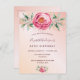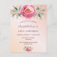 Una invitación romántica para una fiesta de cumpleaños número 50 (o cualquier edad). Un fondo degradado de rosa oro y rosa suave. Una gran rosa pintada con acuarela en rosa, hojas verdes, follaje con pequeñas flores doradas. Una banda de brillo falso de rosa oro detrás de las flores. Personaliza y agrega un nombre y detalles de la fiesta. Letras de color rosa oro oscuro. El nombre está escrito con un estilo de letra manuscrita moderna.