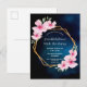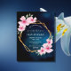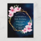 Una invitación floral tropical de 50 años (o de cualquier edad) con flores de hibisco rosa, vegetación y un marco geométrico de oro falso. Un cielo azul oscuro como fondo. Plantillas para un nombre escrito con un script de estilo moderno con letras a mano, plantillas para la información del fiesta. Texto blanco. ¡Ideal para celebrar el verano, la piscina o la playa! Atrás: carta simple. Sugerencia: Si no desea que se vea como una postal, haga clic en personalizar, vaya a la parte posterior y quite el separador y el sello postal.