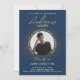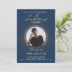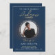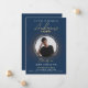 Es hora de celebrar su graduación e invitar a sus invitados a un fiesta con esta moderna invitación fotográfica. En el frente hay un diseño minimalista con un falso guión moderno dorado y blanco y una foto de personalizable en un fondo azul marino oscuro. La parte trasera tiene el mismo fondo azul, sobrio y de diseño. Puedes cambiar la foto y los textos y hacer una invitación personalizada.