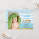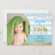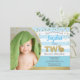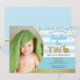 Invitación de foto de fiesta con tema de conejito lindo en azul y dorado para el segundo cumpleaños del bebé.